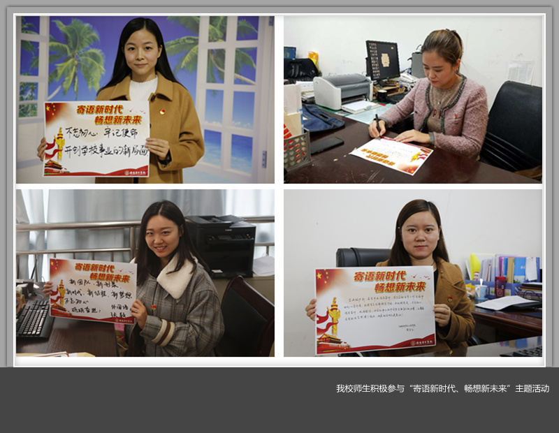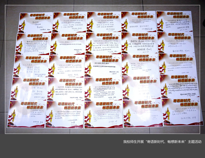 近日,由我校党委宣传部发起,在全校党员干部、师生员工中开展了别具特色的“寄语新时代、畅想新未来”主题活动。引导大家撰写对十九大精神的感悟,畅想对美好新时代的向往。全体校领导、党员干部、师生代表纷纷在主题卡片上写下了身处新时代的喜悦、幸福之情和踏上新征程的豪迈、激动之情。用这样一种特别的方式掀起我校学习十九大精神的篇章。