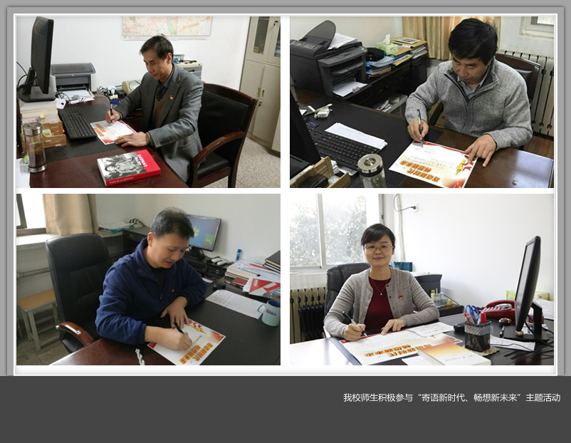 “坚定理想信念,志存高远,脚踏实地,和广大青年一起放飞青春梦想,书写时代华章”。这是经济与管理学院辅导员丁晨的心里话;“我们要努力学习,不负青春韶光,不负这美好的时代”,这是人文学院大学生党员白雪写下的心声;会计学院2017级新生吴思祺写道:“作为刚入校的青年大学生,我们要脚踏实地,努力学习科学文化知识,为实现中国梦贡献一份力量。”大学生创业者侯磊写道:“我们的梦想有多雄奇,中国就有多美丽,作为青年创业大军的一员,希望能为学校为祖国贡献自己的一份力量。”在环化学院实验室里,教师杨瑞先写道:“希望学校在转型发展的路上越走越好,开创应用型人才培养的新模式,为社会培养更多的人才。”