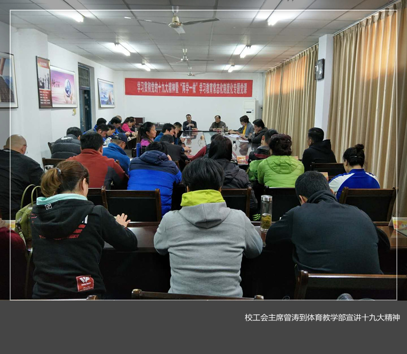 11月9日下午,体育教学部党总支举行学习贯彻党的十九大精神暨“两学一做”学习教育常态化制度化专题党课,校工会主席曾涛以“信仰为人民,人民有信仰”为题宣讲十九大精神,体育教学部全体党员和教师聆听了党课,。