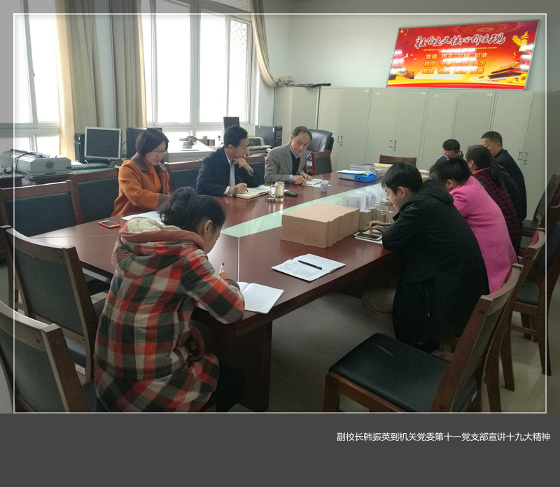 11月9日下午,机关党委第十一党支部召开支部大会,认真学习党的十九大精神。副校长韩振英以《深入学习贯彻党的十九大精神,用新思想武装头脑、指导实践、推动工作》为题,从“八个明确”的内涵实质,到“十四个坚持”的基本方略,深刻解读了习近平新时代中国特色社会主义思想,要求党员干部认真学习贯彻党的十九大精神,要学习领会好习近平新时代中国特色社会主义思想,在武装头脑、指导实践、推动工作上取得实效。