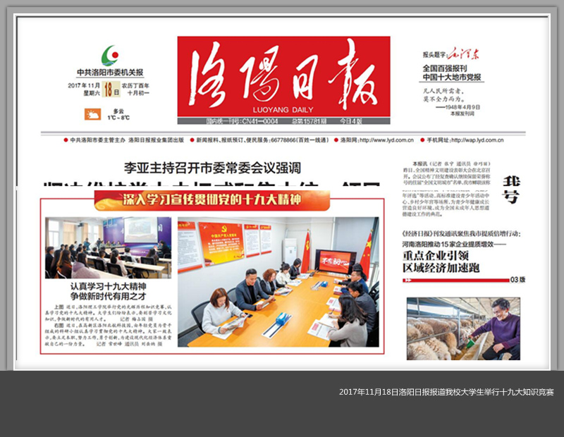 2017年11月18日出版的洛阳日报,头版以《认真学习十九大精神、争做新时代有用之才》为题发布了我校大学生举行十九大知识竞赛的图文报道。