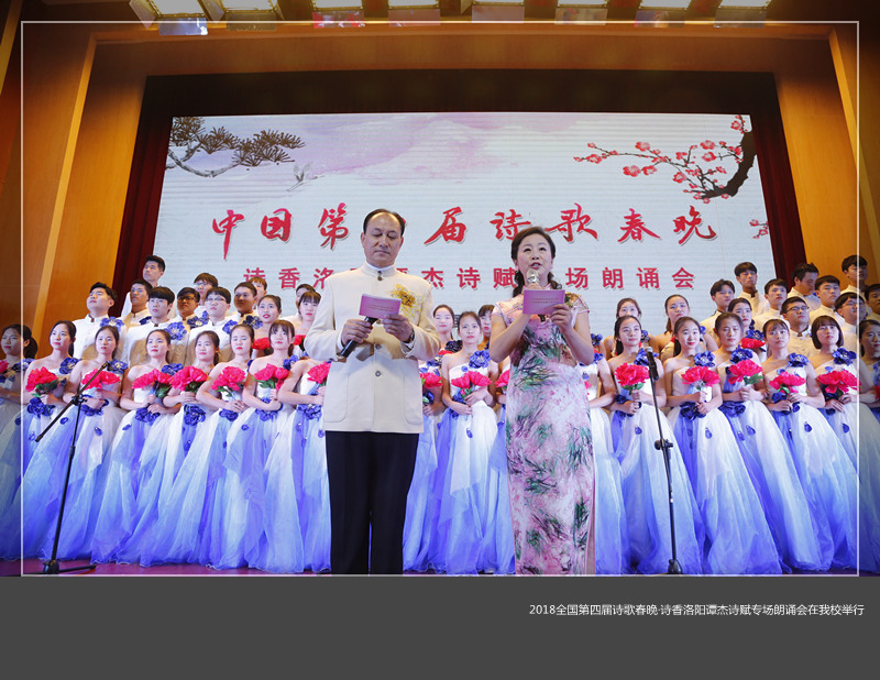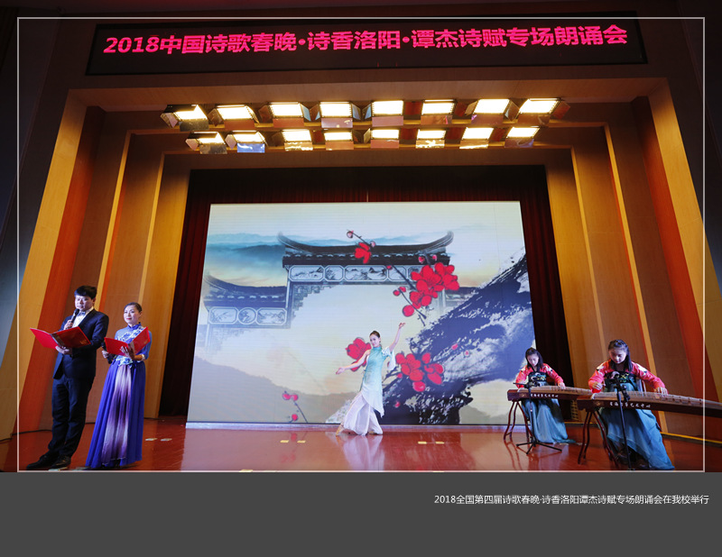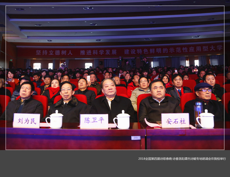 1月7日下午,2018中国第四届诗歌春晚·诗香洛阳谭杰诗赋专场朗诵会在我校王城校区图书信息中心学术报告厅举行。洛阳市人大副主任陈卫平,市政协副主席安石柱,市政协原副主席刘为民,市委宣传部副部长、市文明办、创建办主任谷连民,市创建办副主任刘乐意,《大河诗刊》主编、河南诗歌学会原主席高旭旺,中国辞赋家协会副主席、洛阳诗词研究会会长谭杰和我校党委宣传部负责人出席。近千名专家学者、诗人和我校学生参加。
