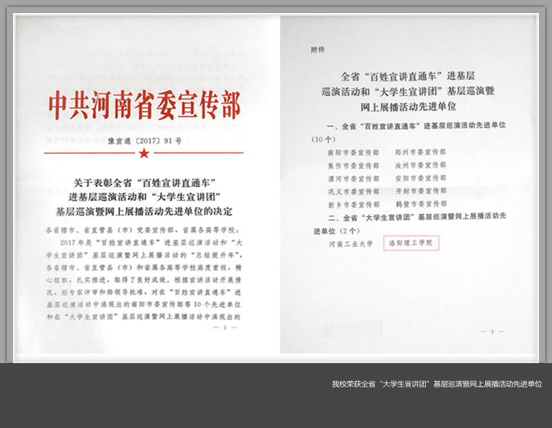 我校精神文明建设又结硕果。近日,中共河南省委宣传部印发《关于表彰全省“百姓宣讲直通车”进基层巡演活动和“大学生宣讲团”基层巡演暨网上展播活动先进单位的决定》(豫宣通〔2017〕91号),对在2017年“百姓宣讲直通车”进基层巡演活动和“大学生宣讲团”基层巡演暨网上展播活动中涌现出的先进单位予以表彰。我校荣获全省“大学生宣讲团”基层巡演暨网上展播活动先进单位,为全省仅有的两所获此殊荣的高校之一。