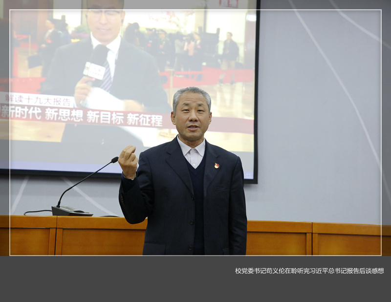 校党委书记苟义伦在聆听完习近平总书记报告后指出, 党的十九大是在全面建成小康社会决胜阶段、中国特色社会主义发展关键时期召开的一次十分重要的大会,是全党全国各族人民政治生活中的一件大事。习近平总书记的报告内容详实,逻辑严密,脉络清晰,高度总结了党十八大以来的辉煌成就,明确了我党在新时代的历史使命,提出了新时代中国特色社会主义思想和基本方略,是党和国家发展的科学纲领和行动指南。学习宣传贯彻十九大精神是我们当前和今后一个时期重要的政治任务,全校上下要迅速兴起学习十九大精神热潮,要周密安排,认真组织好两级中心组和全体党员、全校师生对习近平总书记报告的学习。要围绕立德树人根本任务,进一步筑牢“四个意识”,坚持“四个自信”,切实坚持用十九大精神武装头脑、指导实践,把十九大报告作出的新部署、新要求和习近平总书记重要讲话蕴含的新思想、新观点,转化为推进学校发展的正确思路,转化为抓好基层党建的具体举措,转化为推动学校工作的强大动力,积极推进特色鲜明的示范性应用型大学建设。