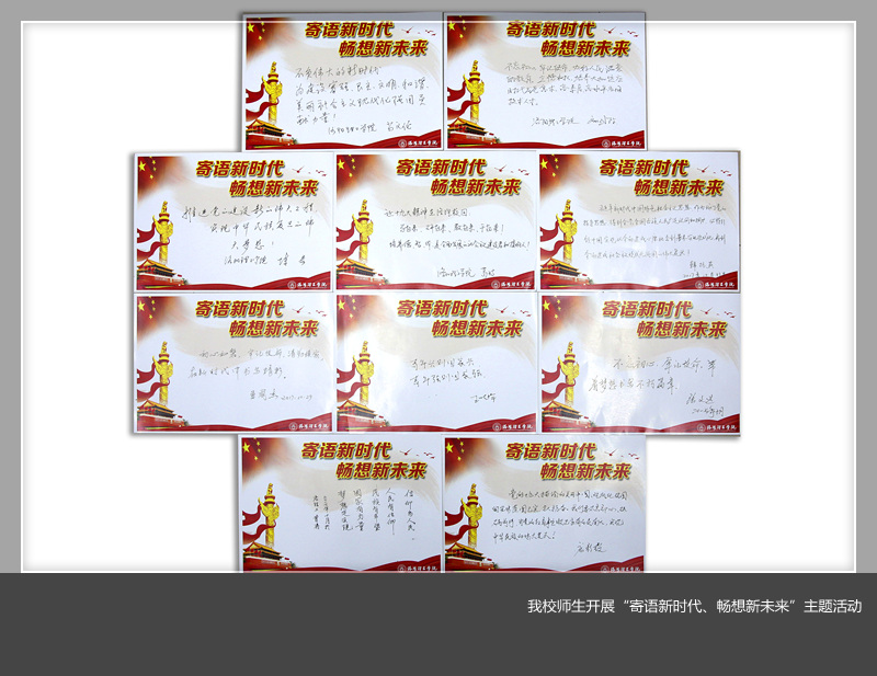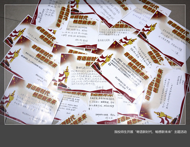 近日,由我校党委宣传部发起,在全校党员干部、师生员工中开展了别具特色的“寄语新时代、畅想新未来”主题活动。引导大家撰写对十九大精神的感悟,畅想对美好新时代的向往。全体校领导、党员干部、师生代表纷纷在主题卡片上写下了身处新时代的喜悦、幸福之情和踏上新征程的豪迈、激动之情。用这样一种特别的方式掀起我校学习十九大精神的篇章。