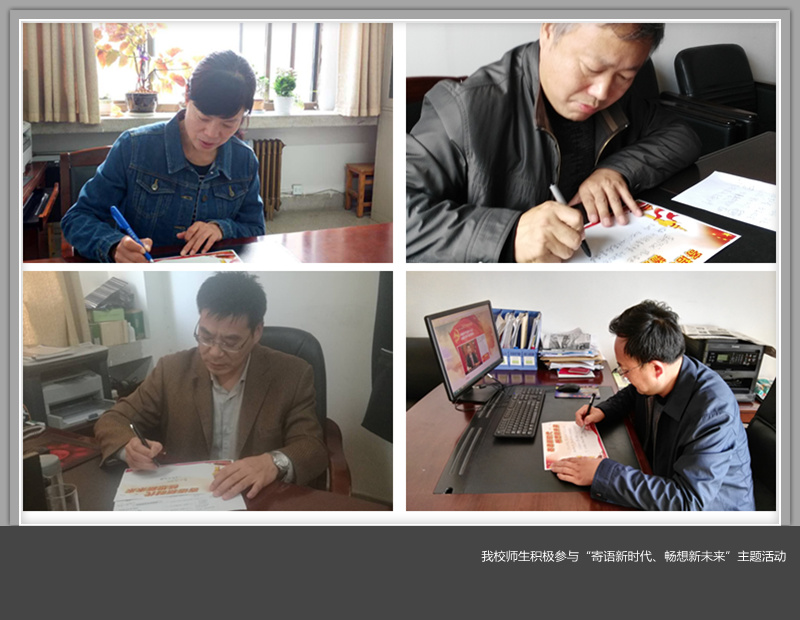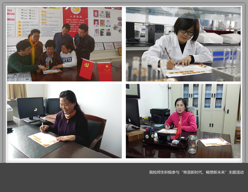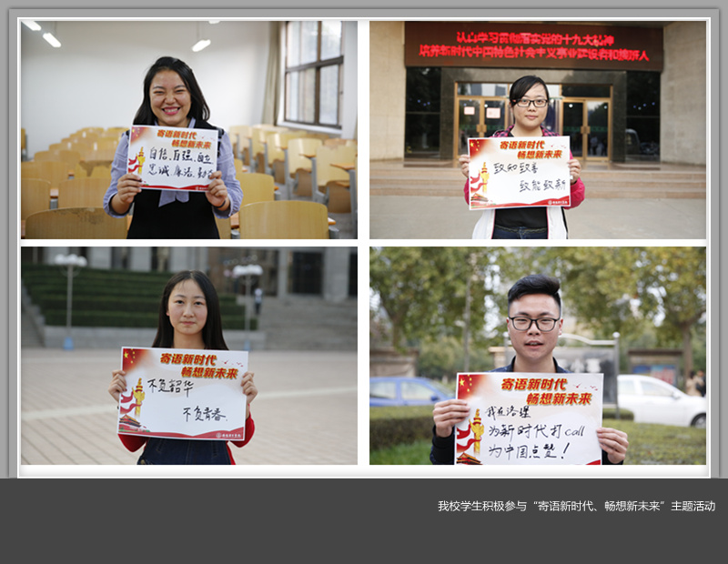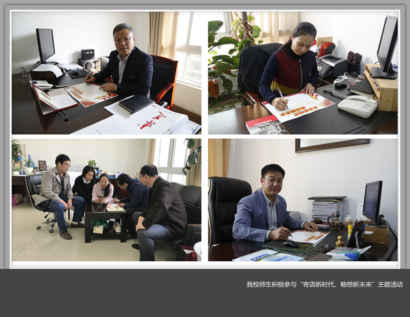 “坚定理想信念,志存高远,脚踏实地,和广大青年一起放飞青春梦想,书写时代华章”。这是经济与管理学院辅导员丁晨的心里话;“我们要努力学习,不负青春韶光,不负这美好的时代”,这是人文学院大学生党员白雪写下的心声;会计学院2017级新生吴思祺写道:“作为刚入校的青年大学生,我们要脚踏实地,努力学习科学文化知识,为实现中国梦贡献一份力量。”大学生创业者侯磊写道:“我们的梦想有多雄奇,中国就有多美丽,作为青年创业大军的一员,希望能为学校为祖国贡献自己的一份力量。”在环化学院实验室里,教师杨瑞先写道:“希望学校在转型发展的路上越走越好,开创应用型人才培养的新模式,为社会培养更多的人才。”