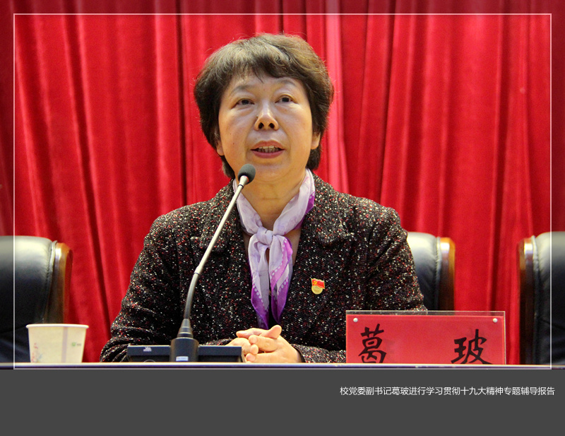 校党委副书记葛玻进行了学习贯彻十九大精神专题辅导报告。她指出,学习十九大精神必须牢牢把握大会主题、大会成果以及会议主要精神这三个关键点。她将十九大报告分成确定奋斗目标、部署规划路线以及党的建设三大板块为同学们详细讲解,加深了同学们对十九大内容、目标的理解。随后,她向同学们阐述了进入新时代所面临的新变化与新要求,并呼吁我校团员青年要增强政治意识,坚定政治信仰,树立正确的价值观,为祖国的建设奉献力量。