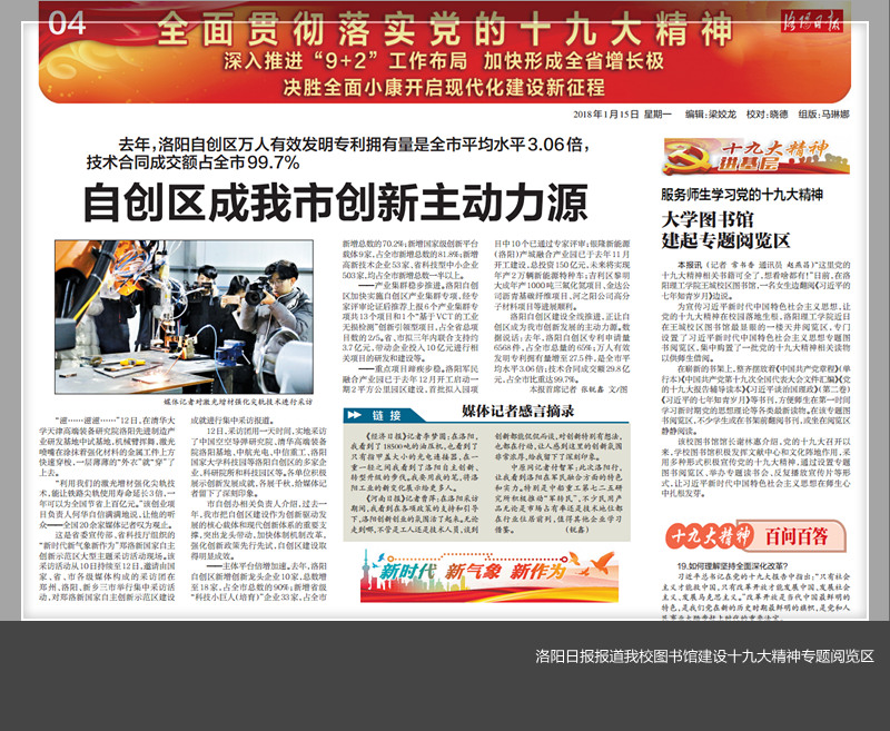 1月15日,洛阳日报第04版以《服务师生学习党的十九大精神 大学图书馆建起专题阅览区》为题,对我校图书馆建设党的十九大精神专题阅览区服务广大师生进行了专题报道。