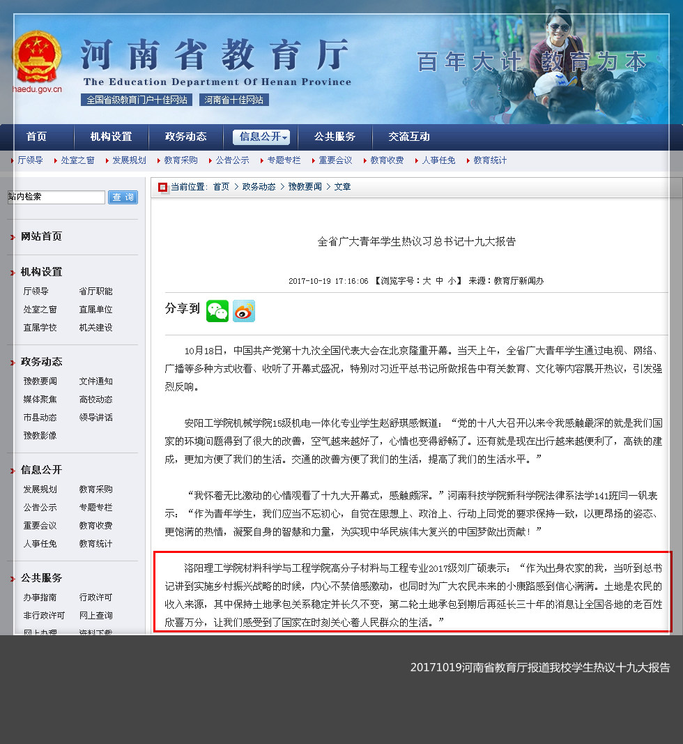 2017年10月19日,省教育厅网站以《全省广大青年学生热议习总书记十九大报告》为题报道了我省广大青年学生收听收看十九大开幕会并热议习总书记报告的反响。