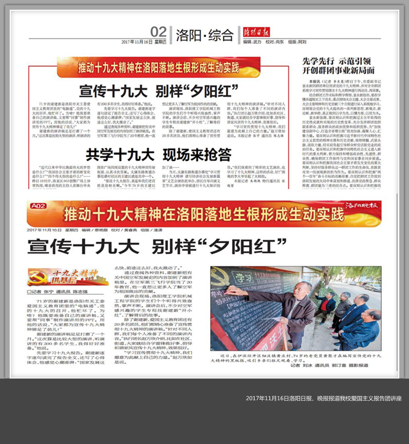 2017年11月16日,洛阳日报第02版、洛阳晚报第A02版以《宣传十九大 别样“夕阳红”》为题分别报道了我校爱国主义宣讲团成员谢建新为机械工程学院学生做十九大报告的专题报道。