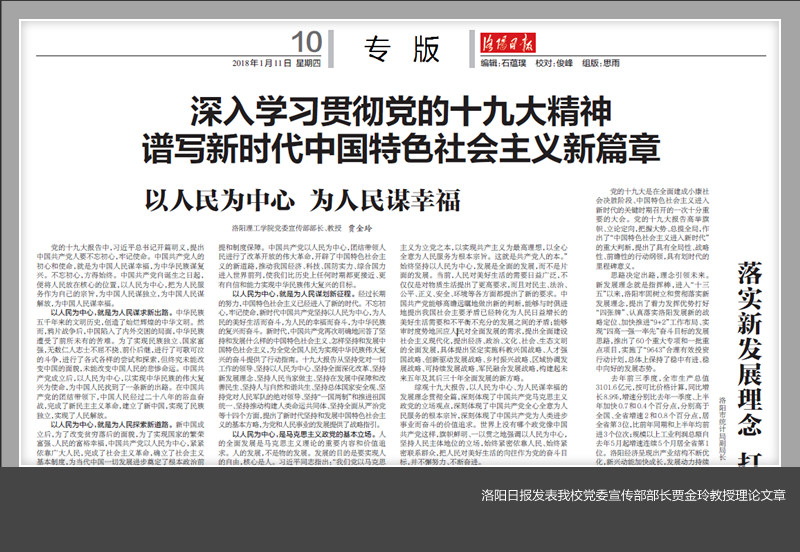 1月11日出版的洛阳日报第010版深入学习贯彻党的十九大精神,谱写新时代中国特色社会主义新篇章专版发表我校党委宣传部部长贾金玲教授理论文章《以人民为中心 为人民谋幸福》