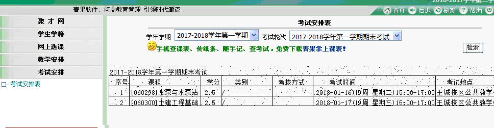 1、期末考试日期为(第19周):2018年1月15日至1月19日,时间:上午9:00—11:00,下午:15:00—17:00。